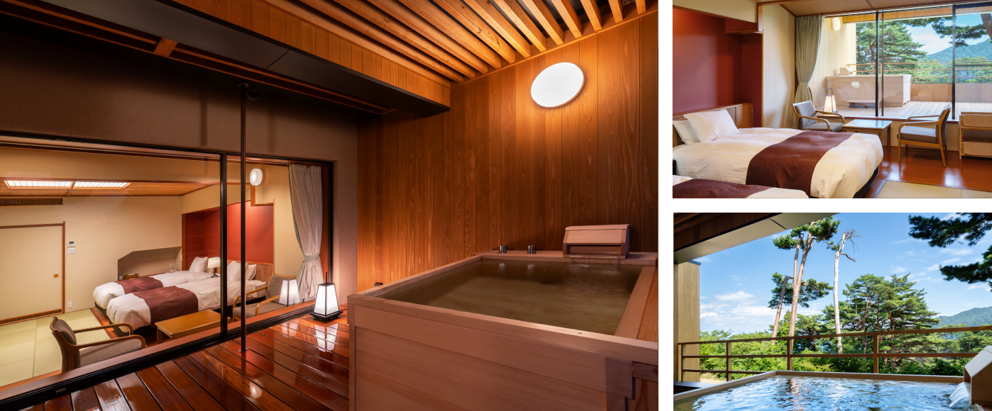 The most luxurious room is located at the corner of our hotel and you can enjoy the scenery of Miyako Bay and the Pacific Ocean. The room includes spacious Japanese-style rooms, a bedroom, a fine view bath, etc. with special decoration.