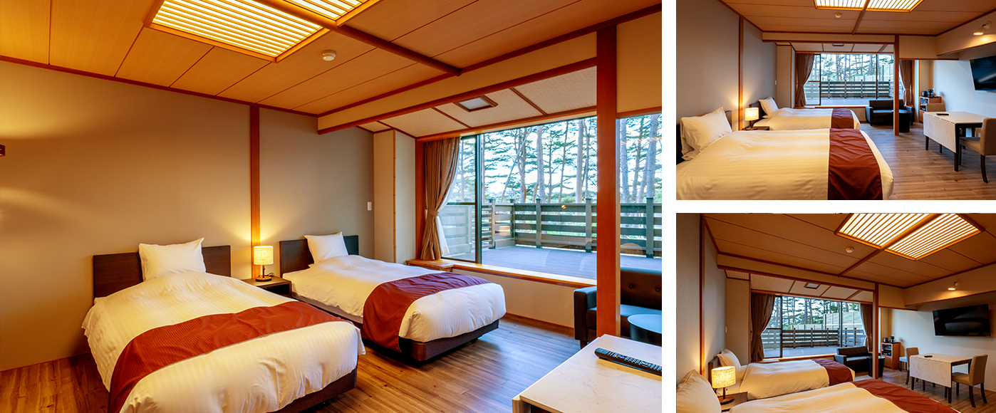 Japanese-style room faces the pine grove (capacity of 5 people) and a western-style twin bedroom faces the pine grove (capacity of 2 people) .