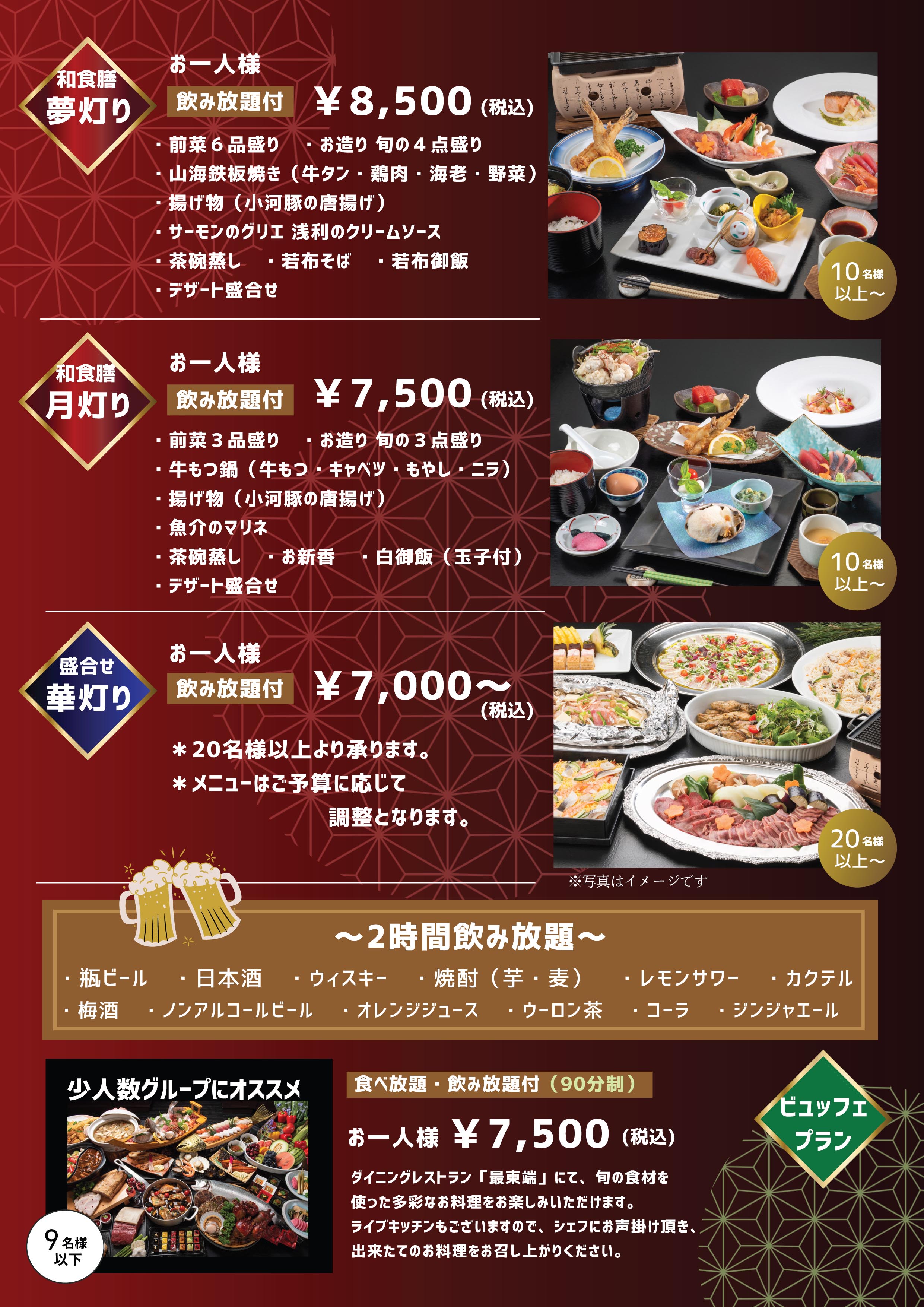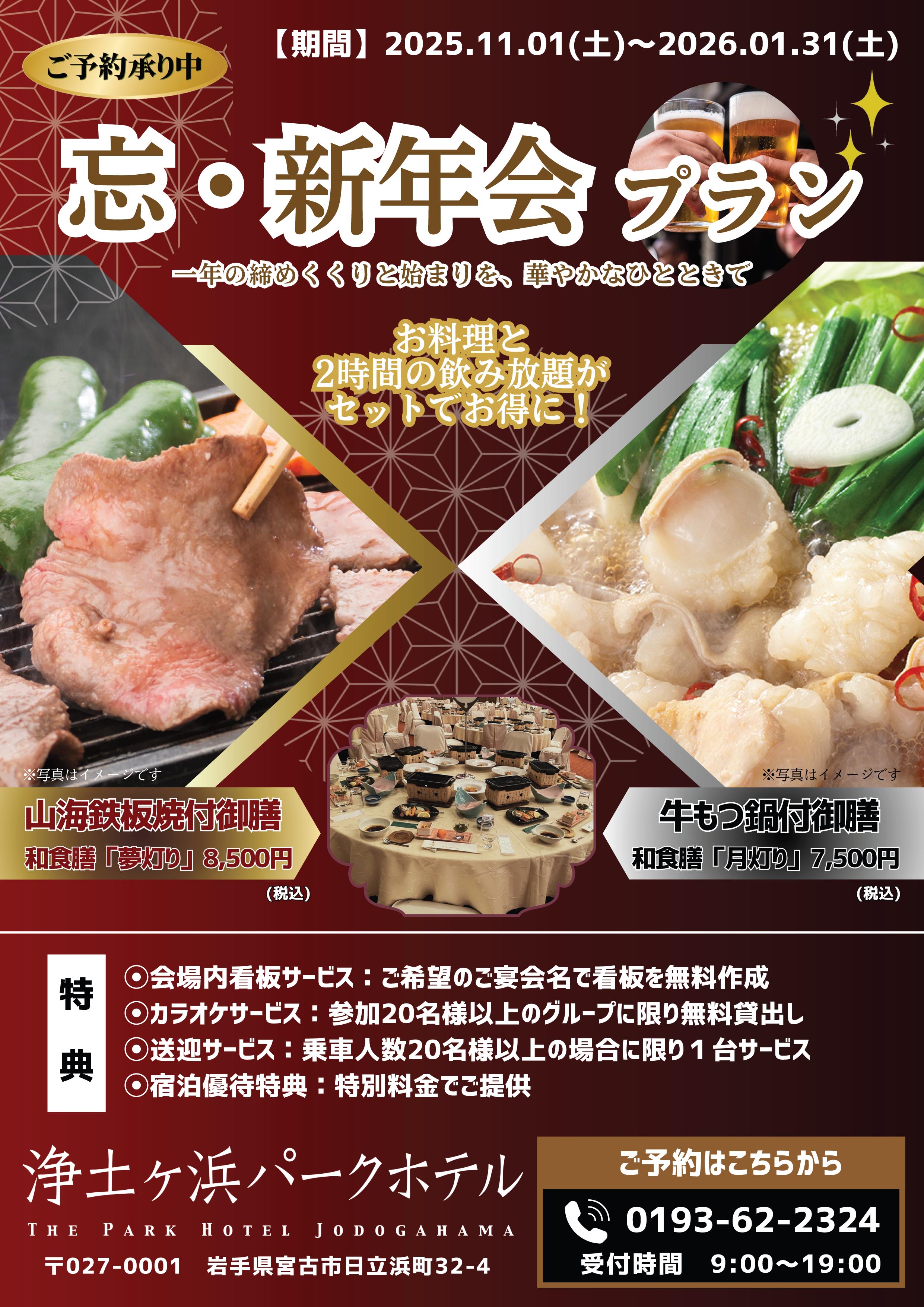 1年の締めくくりと始まりを華やかなひとときで。忘新年会プランご予約承り中! 日頃より当館をご愛顧いただきありがとうございます。 当館から忘新年会プランのご案内です。 料金: お一人様税込7,500円~ 人数: 10名様からご予約可能 0193-62-2324(受付時間 9:00~19:00)