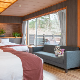 愛犬ステイルーム・スイート 大切な家族と一緒に宿泊 愛犬と一緒に泊まれるファミリー向け(最大4名様)の新設客室です。ご家族やグループでご利用頂ける広々スペースで愛犬とゆったり過ごせる空間をご提供いたします。 ご予約はこちら 【定員】4名 【広さ】洋室+ドッグラン付/80㎡ ご予約はこちら