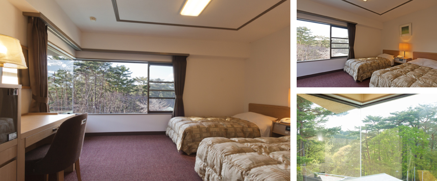 ห้องนอนเตียงคู่สไตล์ญี่ปุ่นที่มาพร้อมอ่างอาบน้ำที่สามารถมองเห็นวิวชายฝั่งซันริกุเหนือป่าสนแดงได้ ทางโรงแรมได้เตรียมห้องพักที่ทำให้คุณสัมผัสได้ถึงลมหายใจของธรรมชาติไว้อีกด้วย